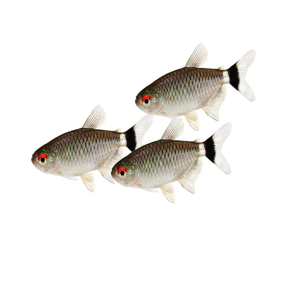 Coloration grise avec une marque noire sur sa caudale et des yeux rouges.